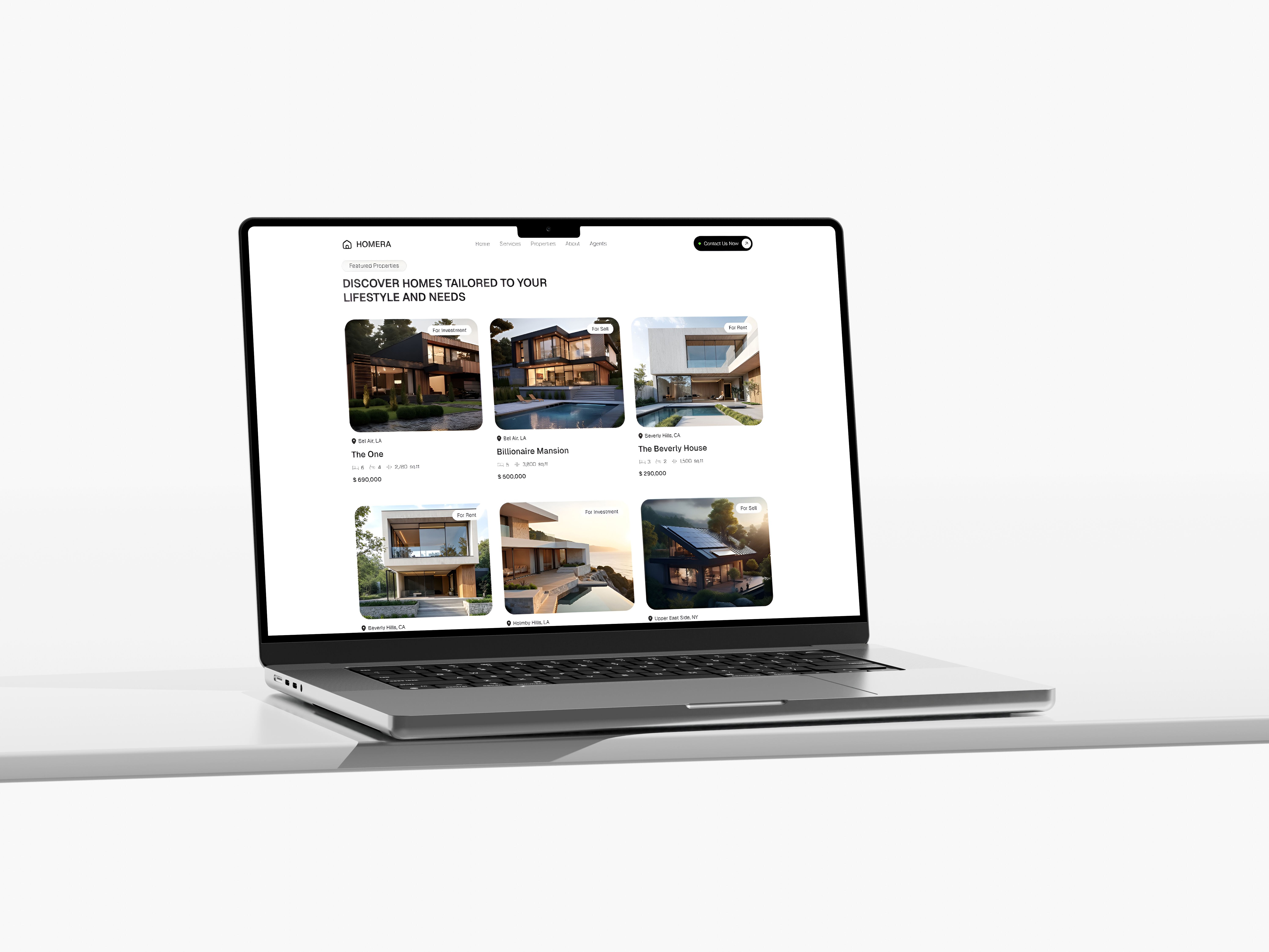 Homera is a digital platform designed to streamline real estate search through an intuitive and personalized user experience. The main goal was to create a website that conveys reliability and professionalism, guiding users from initial discovery to connecting with real estate agents. The design emphasizes visual clarity with a well-defined information hierarchy and smooth navigation that reduces cognitive friction.